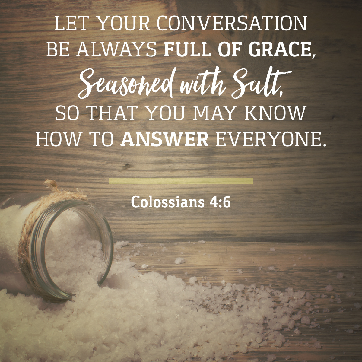 Paul then admonishes us to be wise with our words and make the most of those God given opportunities to talk with believers and unbelievers about Christ. Look for those God appointments as I like to call them. When talking with unbelievers, don’t try to argue with them but be salt and light giving them words filled with grace and love. Tell them about your love for Jesus and the difference He has made in your life. I love 1 Peter 3:15 ” But in your hearts revere Christ as Lord. Always be prepared to give an answer to everyone who asks you to give the reason for the hope that you have. But do this with gentleness and respect.” Impetuous Peter had learned that you don’t beat someone over the head with the gospel but present the words of life with gentleness and respect. Being wise with our words shows love and grace towards others.