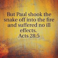 Acts 28:3-6 3 Paul gathered a pile of brushwood and, as he put it on the fire, a viper, driven out by the heat, fastened itself on his hand. 4 When the islanders saw the snake hanging from his hand, they said to each other, “This man must be a murderer; for though he escaped from the sea, the goddess Justice has not allowed him to live.” 5 But Paul shook the snake off into the fire and suffered no ill effects. 6 The people expected him to swell up or suddenly fall dead; but after waiting a long time and seeing nothing unusual happen to him, they changed their minds and said he was a god.