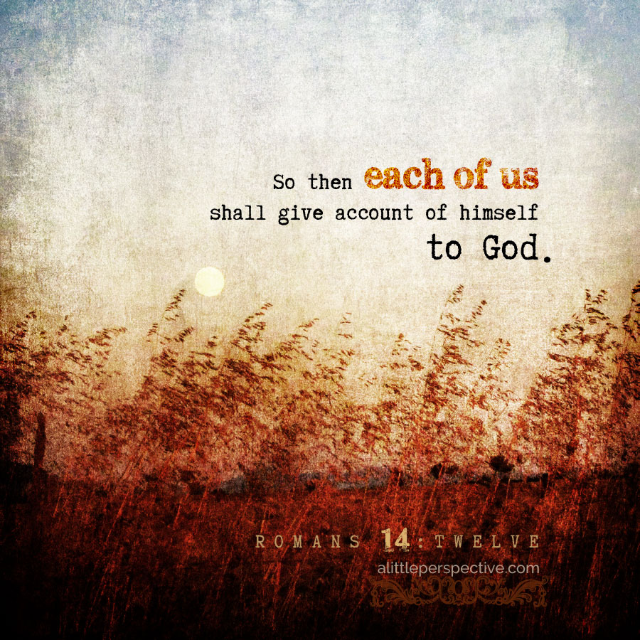 12 So then, each of us will give an account of ourselves to God. 13 Therefore let us stop passing judgment on one another. Instead, make up your mind not to put any stumbling block or obstacle in the way of a brother or sister.