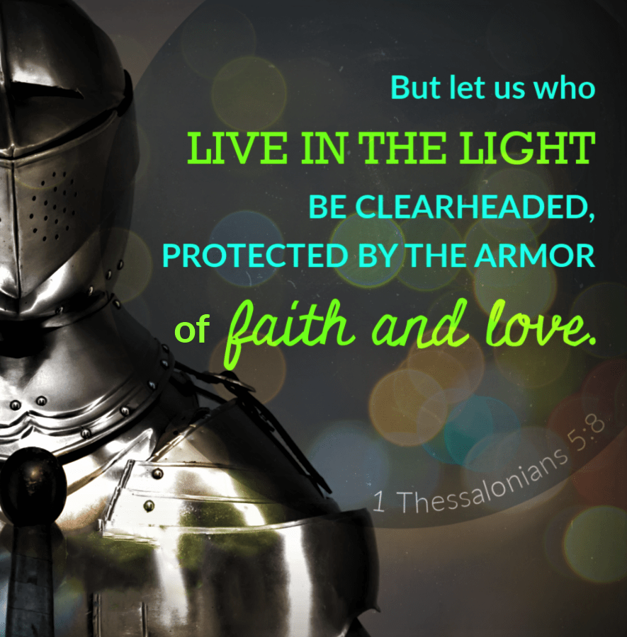 Today I am looking at 1 Thessalonians 5:8 “But since we belong to the day, let us be sober, putting on faith and love as a breastplate, and the hope of salvation as a helmet.” This is a great verse with very clear message of what we are to ‘put on’ as believers. Paul is talking in this passage about Christ’s return and our belonging to His light as we not longer live in the darkness of sin. Verse 5, “You are all children of the light and children of the day. We do not belong to the night or to the darkness.” We can live each day in His light assured that we belong to Him. I love 1 John 1:5 “This is the message we have heard from him (Jesus) and declare to you: God is light; in him there is no darkness at all.