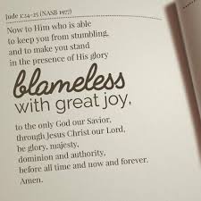 Jude 1:24-25 “Now to him who is able to keep you from stumbling and to present you blameless before the presence of his glory with great joy, 25 to the only God, our Savior, through Jesus Christ our Lord, be glory, majesty, dominion, and authority, before all time and now and forever. Amen.