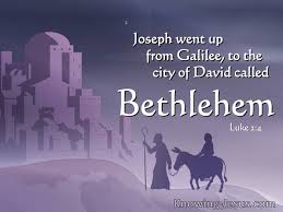 Luke 2:1-5  In those days Caesar Augustus issued a decree that a census should be taken of the entire Roman world. (This was the first census that took place while Quirinius was governor of Syria.) And everyone went to their own town to register. So Joseph also went up from the town of Nazareth in Galilee to Judea, to Bethlehem the town of David, because he belonged to the house and line of David. He went there to register with Mary, who was pledged to be married to him and was expecting a child.